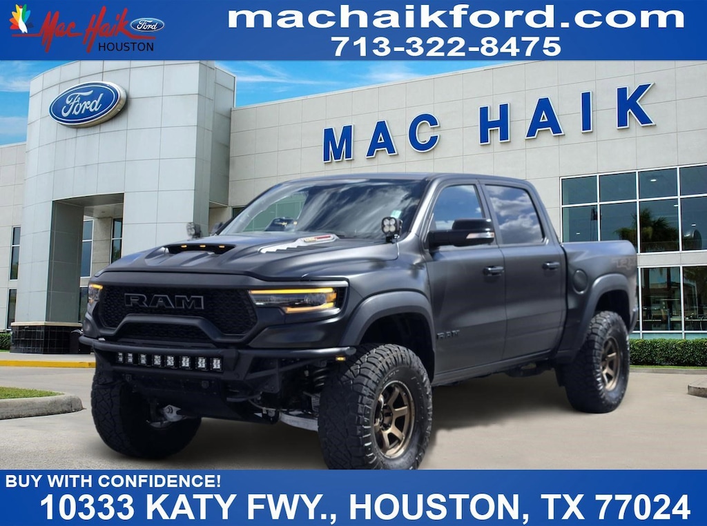 Why Buy From Mac Haik Ford Houston-- At Mac Haik Ford Houston, a family-owned and operated dealership proudly serving Houston for over 40 years, we make cars buy simple, transparent, and stress-free. ⢠Transparent Pricing â" No hidden fees, just honest, upfront pricing ⢠Competitive Deals â" Priced to compete with the best in the Texas market ⢠Easy Buying Process â" Shop, get pre-approved, and value your trade online ⢠Huge Selection â" New and Pre-owned and Certified vehicles ready to go ⢠Customer First â" Friendly, no-pressure experience ⢠Service You Can Count On â" Weâre here long after the sale. Vehicle Specs: Quick Order Package 29Y, TRX Level 1 Equipment Group (4 Way Front Headrests, Body Color Door Handles, Bucket Seats, Driver/Passenger Wrapped Assist Handles, Front Door Accent Lighting, Full Length Premium Upgraded Floor Console, Heated Front Seats, Heated Steering Wheel, IP LED Ambient Light Pipe, Leather Trimmed Bucket Seats, Leather/Suede Flat-Bottom Steering Wheel, Luxury Front Door Trim Panel, Pick-Up Box Lighting, Power 4-Way Driver Lumbar Adjust, Power 4-Way Passenger Lumbar Adjust, Power 8-Way Driver & Passenger Seats, Power Adjustable Pedals, Premium Wrapped IP Bezel, Rain Sensitive Windshield Wipers, Rear Door Accent Lighting, Rear Underseat Compartment Storage, Rear Window Defroster, Sun Visors w/Illuminated Vanity Mirrors, and Universal Garage Door Opener), 1500 TRX, 4D Crew Cab, 6.2L Supercharged HEMI V8 SRT, 8-Speed Automatic, 4WD, Granite Crystal Metallic Clearcoat, Black w/Premium Leather Trimmed Bucket Seats, 10 Speakers, 3.55 Rear Axle Ratio, 4-Wheel Disc Brakes, ABS brakes, Adaptive suspension, Air Conditioning, Alloy wheels, AM/FM radio: SiriusXM with 360L, Apple CarPlay/Android Auto, Auto High-beam Headlights, Auto-dimming door mirrors, Auto-dimming Rear-View mirror, Automatic temperature control, Black Exterior Mirrors, Blind Spot & Cross Path Detection, Brake assist, Cloth/Vinyl Bucket Seats, Compass, Delay-off headlights, Driver door bin, Dual front impact airbags, Dual front side impact airbags, Electronic Stability Control, Emergency communication system: SiriusXM Guardian, Exterior Mirrors Courtesy Lamps, Exterior Mirrors w/Heating Element, Exterior Mirrors w/Supplemental Signals, Front anti-roll bar, Front Bucket Seats, Front Center Armrest w/Storage, Front dual zone A/C, Front fog lights, Front License Plate Bracket, Front reading lights, Front wheel independent suspension, Fully automatic headlights, Heated door mirrors, Illuminated entry, Leather Shift Knob, Leather steering wheel, Low tire pressure warning, Manufacturer's Statement of Origin, Navigation System, Occupant sensing airbag, Outside temperature display, Overhead airbag, Overhead console, Panic alarm, ParkSense Front/Rear Park Assist w/Stop, ParkView Rear Back-Up Camera, Passenger door bin, Passenger vanity mirror, Power door mirrors, Power driver seat, Power steering, Power windows, Power-Folding Mirrors, Radio data system, Radio: Uconnect 12 w/Navigation, Rear seat center armrest, Rear step bumper, Remote keyless entry, Security system, Speed control, Split folding rear seat, Sport steering wheel, Steering wheel mounted audio controls, Tachometer, Telescoping steering wheel, Tilt steering wheel, Traction control, Trip computer, Turn signal indicator mirrors, Variably intermittent wipers, Voltmeter, and Wheels: 18" x 9" Black Paint/Polish Aluminum.